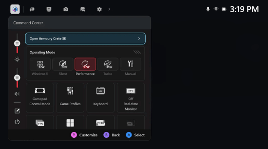 此外,还有一个游戏copilot助手,你可以向它询问通关提示,或者查看成就进度。ai会接收你当前游戏的截图,从而提供帮助。如果你熟悉rog ally掌机,对华硕armoury crate应用肯定不陌生。这款软件依然用于切换性能模式、显示叠加界面等。