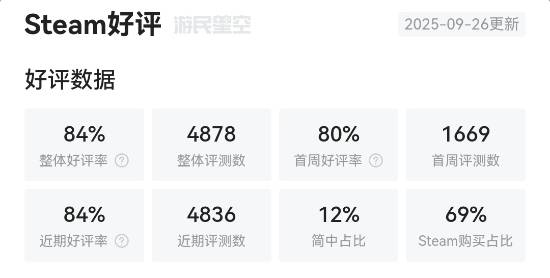 游戏目前已经正式发售,根据数据,本作在steam上的整体好评率为87%,评价等级为“特别好评”。但简中好评率仅为74%,评价等级为“多半好评”。