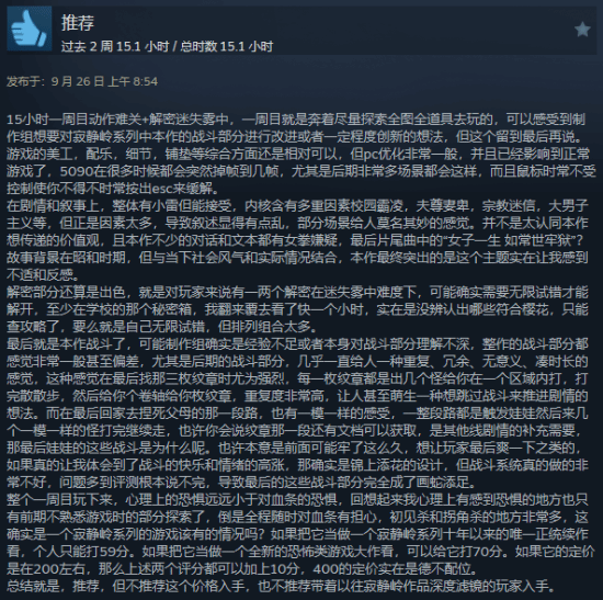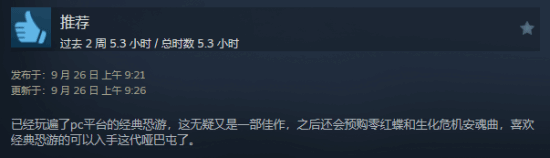 在新的评测当中,给出好评的玩家表示本作又是一款恐游佳作,推荐喜欢经典恐怖游戏的玩家入手。