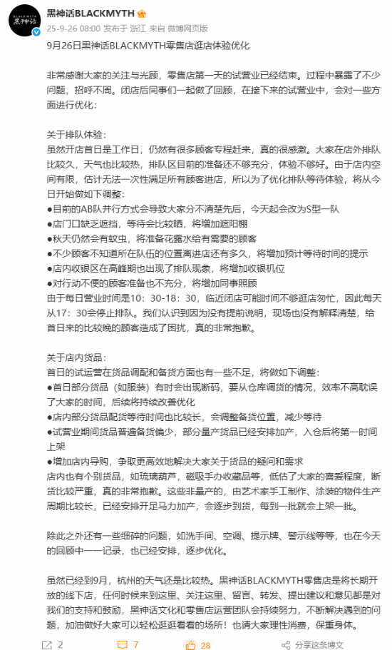 黑神话的首家线下店铺“黑神话blackmyth零售店”于昨日开启试营业,地址在浙江省杭州市西湖区转塘街道艺创小镇凤凰创意国际c3幢,营业时间为每周一至周日10:30-18:30。今日,黑神话blackmyth官方在微博发布了一篇声明,表示昨日闭店后,和同事们一起做了回顾,在接下来的试营业中,会对一些方面进行优化,一起来看下。