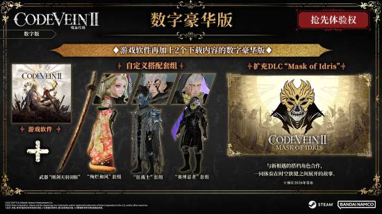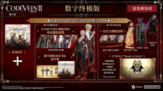 数字终极版售价468元,可在游戏正式发售3天前游玩,包含数字豪华版内容、数字终极版套组(以前作《噬血代码》登场的搭档角色服装为概念的服装套组,收录服装共有6种:伊奥、路易、八云、米亚、杰克、艾娃)和数字迷你美术书&原声带。