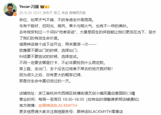 黑神话的首家线下店铺“黑神话blackmyth零售店”于今日开启试营业,地址在浙江省杭州市西湖区转塘街道艺创小镇凤凰创意国际c3幢,营业时间为每周一至周日10:30-18:30。同日,《黑神话》系列制作人冯骥在微博发文,安利了线下店铺,一起来看下。