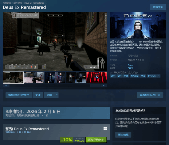 本作的steam界面目前也已公开,国区售价108元,现预购促销优惠10%,仅需97.2元,发售日为2026年2月6日,支持简体中文。