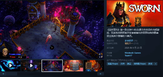 亚瑟王题材的多人roguelike游戏《圣杯誓约》上线,本作是一款windwalk games制作开发team17发行的多人肉鸽游戏,此前均为抢鲜体验版本,直至9月23日发布了正式版本。《圣杯誓约》是一款支持1-4名玩家合作的动作肉鸽游戏,玩家将共同探索并收复被腐化的亚瑟和他的圆桌骑士统治下倒塌的卡美洛。 独自或合作游玩 独自或与好友共同游玩,将角色的优势巧妙结合,掌握技能,并成为足以与亚瑟抗衡的骑士。本作国区定价75元,首发折扣50.25元