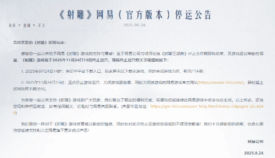 网易旗下的mmo游戏《射雕》今日发布了停运公告,宣布将于2025年11月24日15时停止运营。