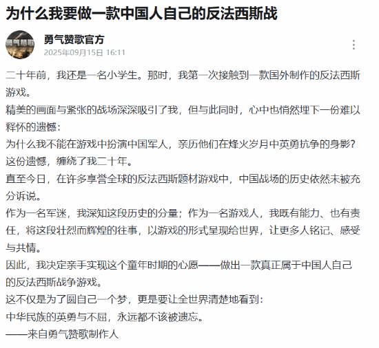 “我决定亲手实现这个童年时期的心愿——做出一款真正属于中国人自己的反法西斯战争游戏。这不仅是为了圆自己一个梦,更是要让全世界清楚地看到:中华民族的英勇与不屈,永远都不该被遗忘。”