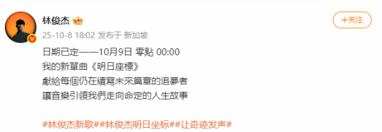 今日,林俊杰为其全新单曲《明日坐标》发布预告,预计将于10月9日0点正式公布。“献给每个仍在续写未来篇章的追梦者,让音乐引领我们走向命定的人生故事。”