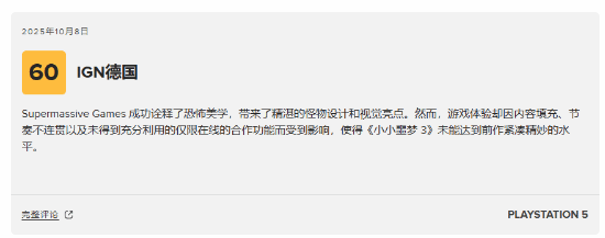 supermassive games成功诠释了该系列的阴森美学,怪物设计与视觉亮点尤为出色。然而,拖沓的内容填充、不稳定的节奏把控,以及仅支持线上联机却未能发挥其特色的合作模式使得本作的游戏体验收到了影响,《小小噩梦3》最终未能达到前作紧凑精妙的水平。