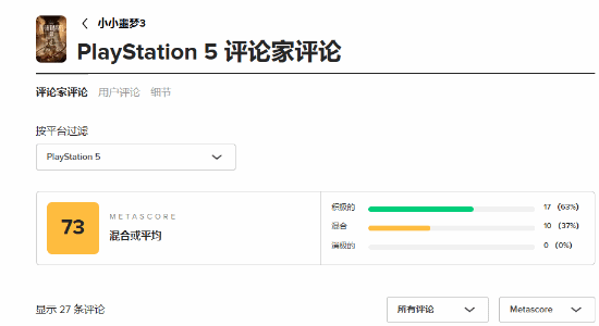截止至发稿时,媒体评分现已全面解禁!m站收录了27条ps5平台的媒体评测,均分73分。其中17家媒体给予好评,10家媒体给予中评,好评率为63%。