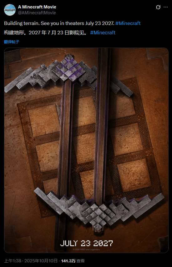 《我的世界大电影》官推账号今日宣布,一部电影续集正在制作当中,预计2027年7月23日上映院线。