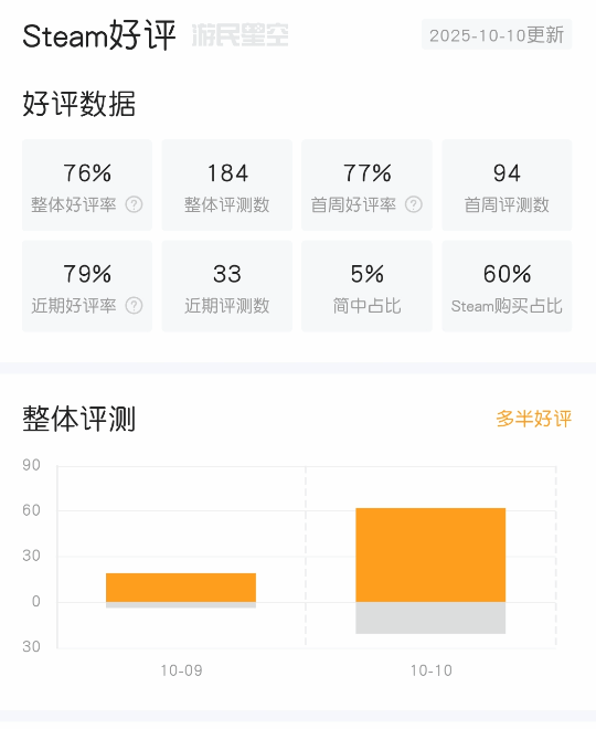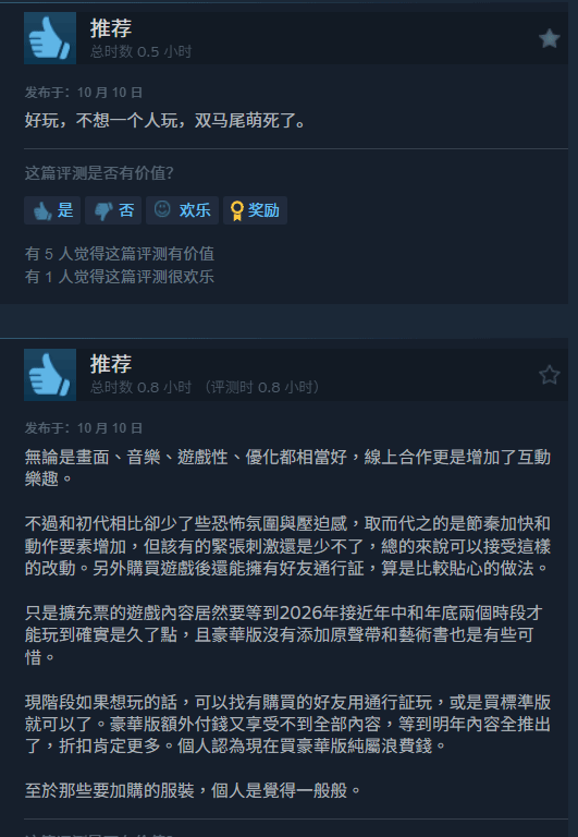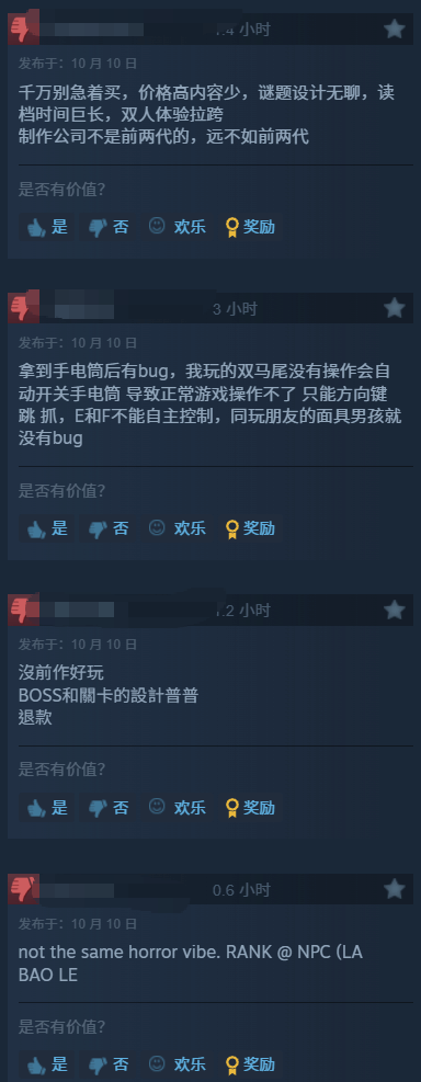 尽管本作延续了前作的恐怖氛围与独特艺术风格,但玩家的评价却显得褒贬不一。截至10月10日,游戏的steam评价为“多半好评”,整体好评率为76%。