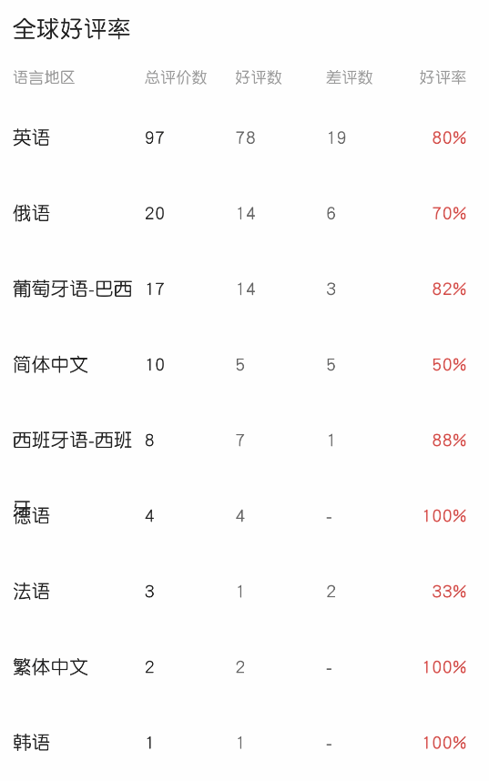 在不同语种的反馈中,英语区的好评率为80%,而俄语区的好评率则较低,只有70%。