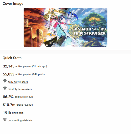 当然了,vg insights的数据不能够保证100%准确,因此仅供参考,一切详细信息应以《数码宝贝物语 时空异客》官方为准。《数码宝贝物语 时空异客》在steam平台的销售表现是否达到了你的预期?一起在评论区聊聊吧!