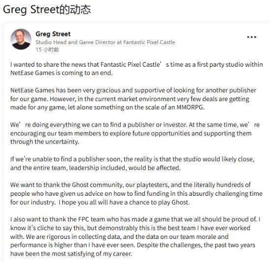 fantastic pixel castle工作室负责人兼游戏总监“鬼蟹”greg street(曾任《魔兽世界》和《英雄联盟》首席系统设计师)在领英透露,团队首款奇幻mmorpg代号ghost正面临严重危机。由于初始投资方网易决定撤资,该项目已在生死边缘。尽管网易与工作室曾共同寻求接盘发行商,但当前市场环境下此举举步维艰。