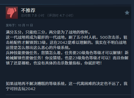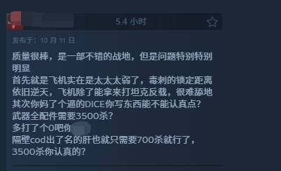 不过,伴随热度而来的还有争议。“肝度过高”成为玩家集中吐槽的问题之一。许多玩家指出,游戏中武器配件等核心内容的解锁门槛极高——有玩家吐槽,一把武器升满级竟需3500次击杀,进度极其缓慢。有人无奈表示,《战地6》的肝度甚至远超《使命召唤》系列,让本应畅快的战场体验变成了一场令人心累的拉锯战。