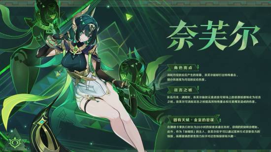 奈芙尔消耗月绽放反应产生的草露,能够打出特殊重击,部分伤害视为月绽放反应伤害。队伍月兆·满辉时,奈芙尔施放元素战技可将场上的草原核与丰壤之核都转化为诳言之核,消耗诳言之核将提高其特殊重击和元素爆发造成的伤害。奈芙尔在挪德卡莱执行时长为20小时的探索派遣任务时,获得的奖励将会增加。