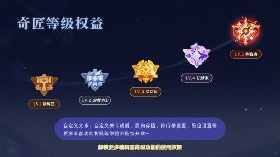 随着创作技术的精进,奇匠还可以逐步提升自己的创作等级,解锁更多编辑器高级功能的使用权限,为玩家带来更丰富的奇域游玩体验!