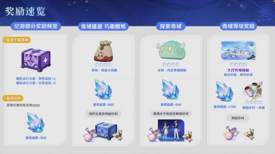 想要获得更多装扮,可以通过「纪游」在完成相应任务之后,提升自己的纪游等级,获取装扮套装等奖励。解锁「诸界纪游」,还可以额外获取更多装扮及特殊奖励。
