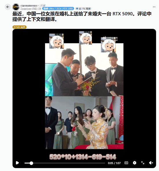 此前曾有小红书网友分享,在结婚当天,新娘为新郎准备了一道复杂的 “中文数字谐音梗”数学题。在新郎快速计算“520×10 1,314-514-619 666-957=5090”后,新娘拿出了为其准备的rtx 5090显卡,给了丈夫一个大大的惊喜!