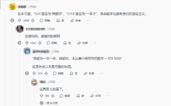 此外,还有网友在评论区解释了这道数学题中各个数字的含义:“520谐音为我爱你,1314谐音为一辈子,其余数字也都有类似的谐音含义。”对此,玩家们称赞:“我爱你一生一世,我爱你,永远属于我等等数字,最终等于rtx5090,这绝对是有史以来最可爱的事情了!”“这也太浪漫了!”