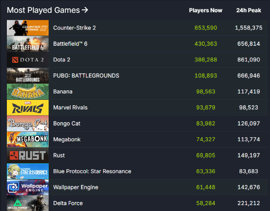 根据数据显示,目前《战地6》在steam平台正与《dota 2》争夺在线玩家数第二的位置,仅次于长期霸榜的《cs2》。