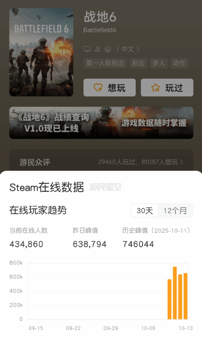 《战地6》正在成为这个老牌军事射击系列的又一里程碑之作。不仅游戏品质优秀,它的人气同样爆炸,根据数据显示,本作在线人数峰值突破了74万,数据相当惊人。