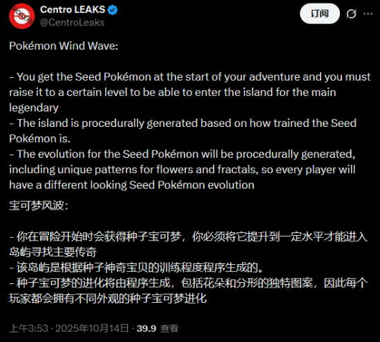 另外,本世代宝可梦据称还将引入“种子宝可梦(seed pokémon)”。这类宝可梦会在玩家旅程之初获得,玩家需将其培养到一定等级,才能前往栖息着传说宝可梦的岛屿。该岛屿的地形会根据“种子宝可梦”的训练程度程序生成。此外,“种子宝可梦”的进化形态也会以程序生成的方式呈现,包含独特花纹,这意味着每位玩家的种子宝可梦都将是独一无二的。