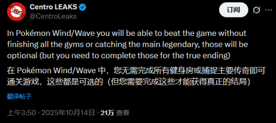 玩家可以在不完成所有道馆或捕获传说宝可梦的情况下通关。所有这些任务都是可选的,但若想达成“真结局”,则必须完成。