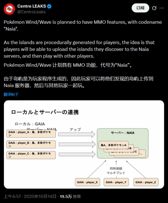 爆料还显示game freak计划在第十世代中融合mmo玩法元素。该mmo功能代号为“naia”,玩家可以将自己探索到的程序生成岛屿上传到naia服务器,与其他玩家共同游玩。