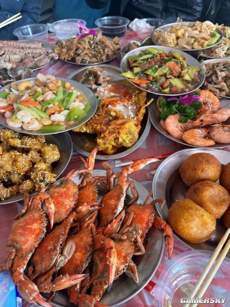 几百块一桌的预算,十二三人一桌,桌上凉热荤素齐备,共计15道地道鲁菜,什么油焖大虾、山东炒鸡、炖猪肘、油淋鲈鱼……这些现场烹饪的菜肴,光是看看就让人垂涎欲滴。