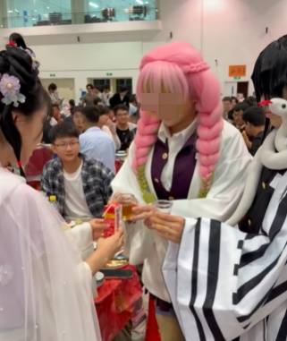 在这种喜气洋洋的氛围下,除了舞台上的各种官方活动,你还能看到各种cp举杯畅游于席间,像婚礼一样向诸位宾客敬酒致意。比如来自《进击的巨人》中的“三笠”与“艾伦”,《鬼柱之刃》中的蛇柱“伊黑小芭内”与恋柱“甘露蜜璃寺”,这“两对夫妻”敬酒的场景从某种意义上完成了粉丝们的夙愿,毕竟在原著中他们都是令人心碎的bd结局。