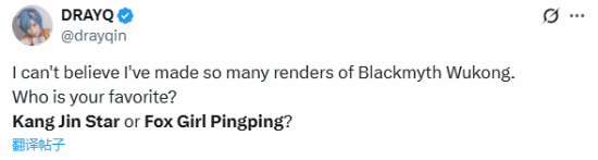 10月16日,@drayqin在推特晒出了自己制作的《黑神话:悟空》部分同人作品,说道:“真不敢相信我已经做了这么多《黑神话:悟空》的渲染图。你最喜欢哪一位?亢金星君还是萍萍?”