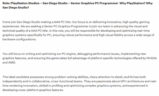 索尼互动娱乐旗下长期负责《mlb the show》系列开发的san diego studio(以下简称sds) 近期发布了一则新招聘信息,意外泄露了其正在开发一款aaa级pc新作的信号。