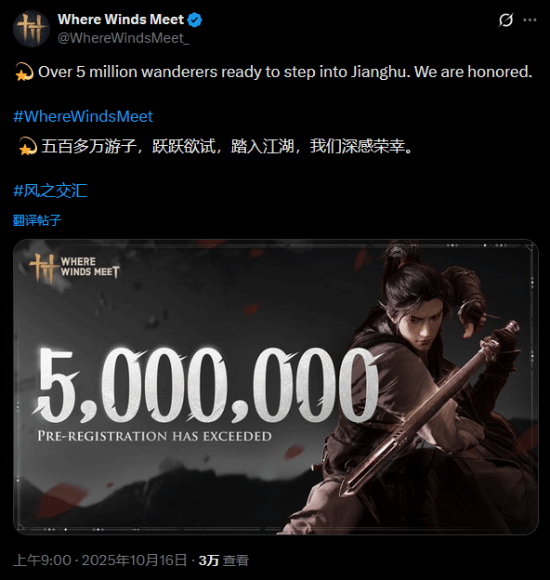 近日,《燕云十六声》官推宣布,其国际服全球预约数目前已经突破500万。