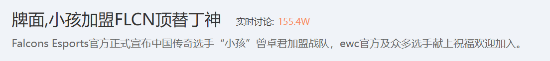 近日,“牌面,小孩加盟 flcn 顶替丁神” 话题登上贴吧热议榜单,falcons esports官方正式宣布中国格斗游戏传奇选手 “小孩” 曾卓君加盟战队。