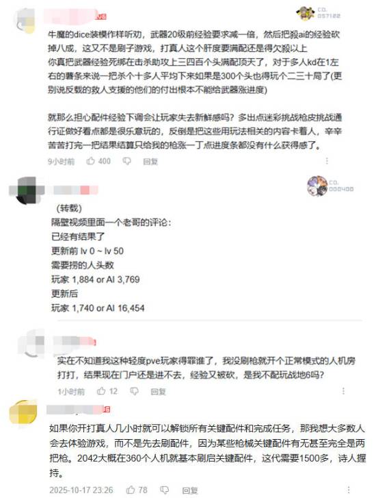 有玩家指出,虽然解锁武器20级前的经验下调了,但也把刷ai机器人的经验值大砍了八成。然而,官方公告中并未提及这一点,不少玩家吐槽开发商搞小动作恶心玩家。
