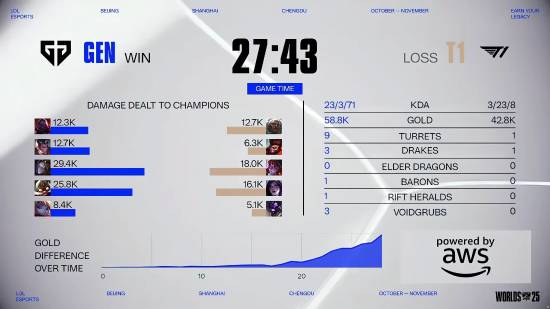 哔哩哔哩英雄联盟赛事表示:“开局16分钟,duro波比锤飞安蓓萨,gen控到峡谷先锋之后双方拉开。18分钟,kiin赛恩顶在前排吸收伤害,chovy发条拿到三个人头并丝血存活,gen打出一换五团战,成功拿下小龙。20分钟,duro波比果断控住安蓓萨,chovy发条再拿双杀,gen拿到厄塔汗并完成一换四。22分钟,canyon赵信击杀猴子,duro波比坚定风采拦下卡莎的进场,gen完成团灭,后续顺利控下听牌龙。25分钟,chovy发条金身规避致命技能,ruler飞机拿到双杀,gen赢得团战并击杀大龙。27分钟,t1背水一战主动开团,但是双方伤害差距显著,chovy发条已经超神,gen摧枯拉朽完成零换五,推平基地拿下本场比赛的胜利!”值得一提的是,t1仅剩最后一次晋级机会。