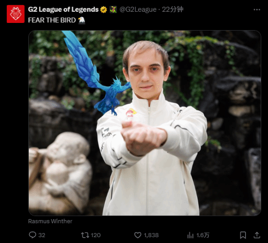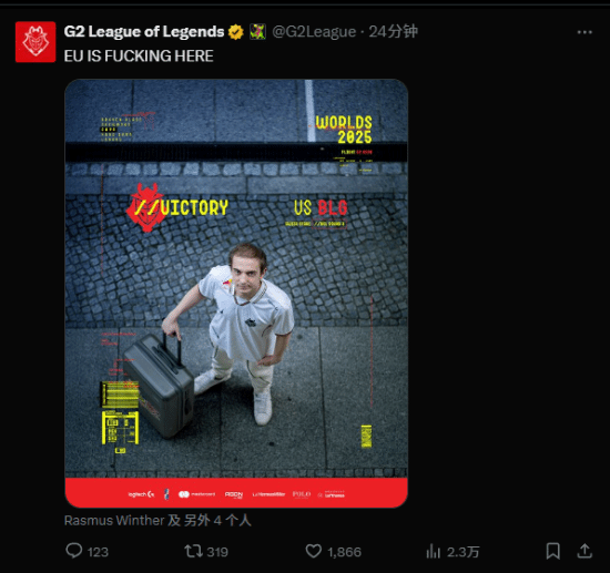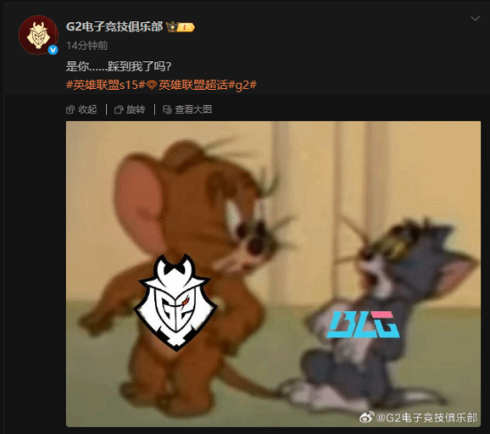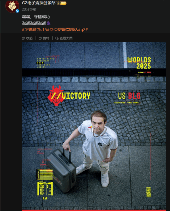 赛后,g2战队国内外官方社媒账号,延续其整活风格,发布梗图庆祝胜利: