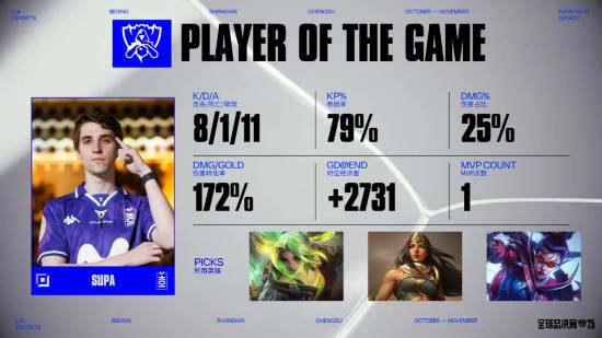 值得一提的是,在第三场对局比赛中,mkoi的ad选手supa竟然选出了薇恩,并以豪华的8-1-11的战绩带领队伍拿下比赛,自己也是拿到了本场mvp。