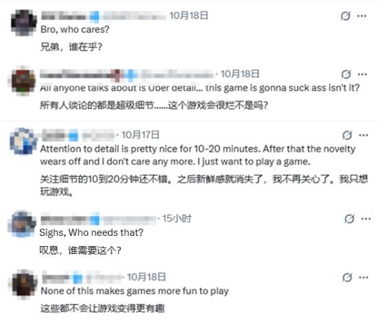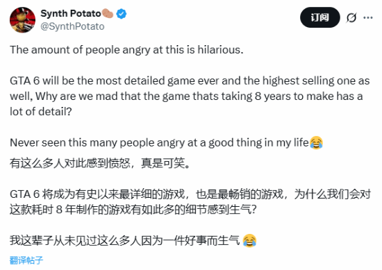 对此,另一位推主@synthpotato发文吐槽道:“对(这样的细节)感到愤怒的人数多得可笑。《gta6》将成为有史以来细节最丰富、销量最高的游戏,这款耗时八年打造的游戏拥有大量细节,我们为什么要表示不满?我这辈子从没见过这么多人对一件好事大发雷霆。”