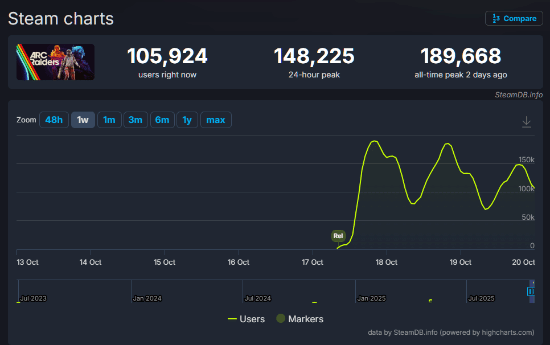 由前ea高管patrick söderlund与前dice开发人员打造的多人合作第三人称射击游戏《arc raiders》将于10月30日正式发售,目前正在进行的服务器压力测试,受到了众多期待该作的玩家追捧,同时在线玩家峰值曾一度接近19万人。